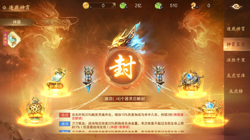 通过逐鹿神霄玩法活动以及运营活动获得对应器灵碎片,激活神器四个器灵,即可解封神器,获得专属技能效果