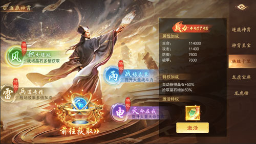 开服30天开启逐鹿备战活动,可通过活动直购获取特权激活道具,获得各种特权效果加成