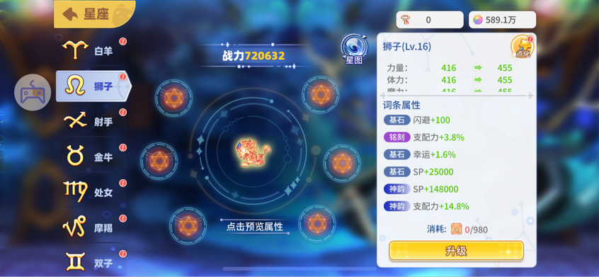 点化建议大家星座等级到15级了再去点化,这样比较节省星象秘语哦!同时每个星座的第一个词条就是最好的属性词条,如果大家点化到了就可以及时收手咯(大佬忽略)
